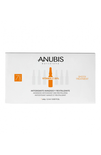 Las ampollas 7 Days Vitamin C 20% de Anubis ofrecen un tratamiento cosmecéutico de acción intensiva para revitalizar la piel, unificar el tono y potenciar su luminosidad natural. Su fórmula con vitamina C pura al 20%, combinada con activos antioxidantes y revitalizantes, protege frente al daño oxidativo, estimula la síntesis de colágeno y devuelve a la piel su vitalidad y firmeza.