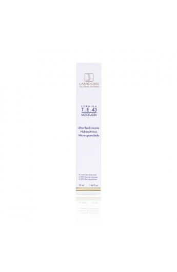 La fórmula Ultra-reafirmante Hidronutritivo T.E.43 MICROELASTÍN es una crema micro-granulada de penetración ultra reafirmante, estimulante circulatoria, hidronutritiva y regeneradora con un alto concentrado en principio activo al 16%. Es una crema que aporta las sustancias esenciales en la piel para su reparación progresiva.