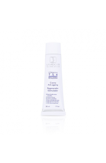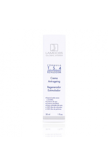 La fórmula T.S.4 RENUDERM es una crema Anti-edad, regeneradora, estimulante, hidratante y antioxidante con un alto concentrado de principio activo al 14,95%. Esta crema esta indicada para tratar el contorno de ojos y labios y puntos vulnerables del rostro. Su fórmula avanzada estimula la regeneración cutánea, refuerza la elasticidad y protege frente a los daños causados por el sol y el envejecimiento prematuro