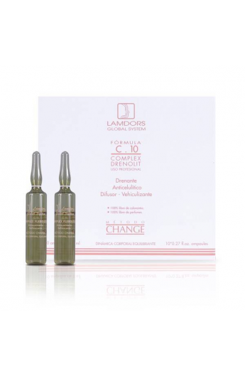 La Fórmula C.10 COMPLEX DRENOLIT es un complejo descongestivo, drenante y magnífico anticelulítico con un alto concentrado en principio activo al 17%. Tratamiento que promueve la disolución de los nódulos celulíticos. Previene y trata las estrías, además de ser un efectivo difusor natural de principios activos. Está indicado para drenaje linfático mejorando la eliminación de retención de líquidos.
