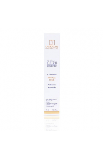 La Fórmula protección avanzada P.S.20 BRONZE EFFECT es una pantalla solar 100% libre de filtros químicos, no irritante de uso diario con efecto Bronze, a base de Dióxido de Titanio Micronizado en combinación con un complejo especial de Vitaminas B5, E y F, un verdadero sistema de tratamiento protector para el sol. Esta combinación especial ayuda a prevenir la quemadura solar proporcionando a la piel una protección segura contra el envejecimiento prematuro, causado por el sol.
